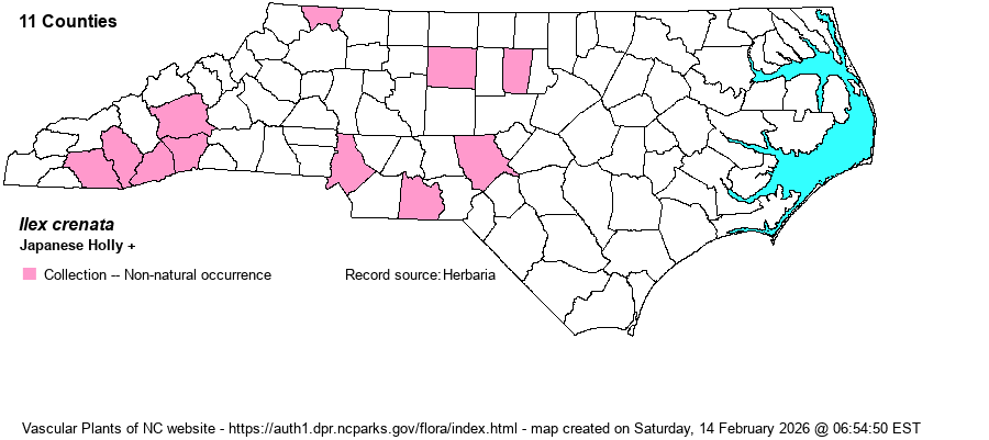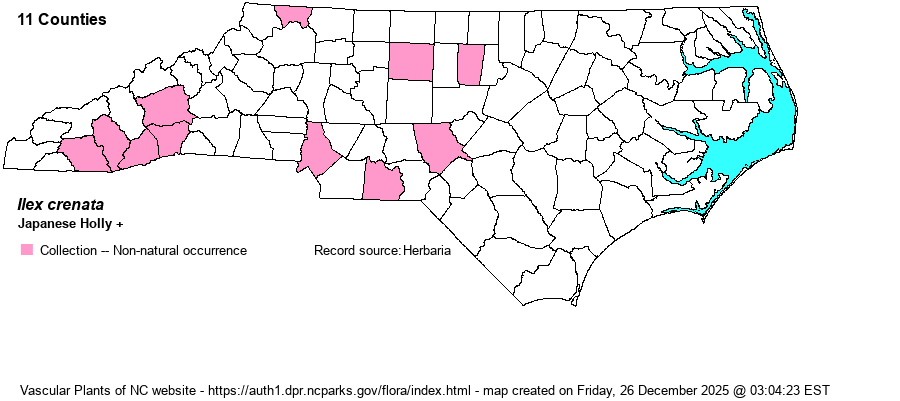 | Identification | This species is very similar to the native I. vomitoria in leaf shape, size, and crenate margins, but the leaf tip is obtuse or acute and has a sharp tooth (vs. notched or retuse and has a small mucro in the notch). The fruits are black (vs. red in I. vomitoria). | |