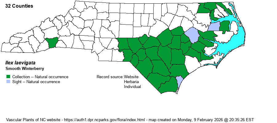 | Habitat | This is a species of acidic waters, mostly found in streamhead pocosins in the Sandhills. However, it also occurs in bay forests, margins of larger pocosins, wet boggy or seepy areas, and other places with damp to wet ground and acidic conditions. It is normally outnumbered by the other two “pocosin” hollies – Ilex glabra and I. coriacea – when they are found in the same area. |