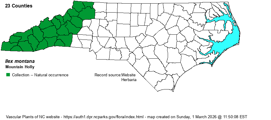 | Distribution | Strictly in the Mountains and foothills. Records for “Ilex montana” in older references for the remainder of the Piedmont and the Coastal Plain now refer to I. ambigua.