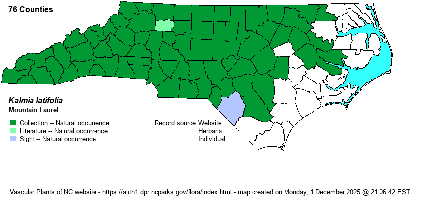 | Identification | This very familiar ericad is a tall evergreen shrub (typically growing to 15-20 feet tall), occasionally considered a very small tree; it is easily recognized when it bloom by its abundance of white to pale pink flowers. It has elliptical, entire, leathery and shiny dark green (above) leaves that average 3 inches long. However, it is frequently misidentified by the public, especially confused with Sweetleaf (Symplocos tinctoria) and with the two small evergreen rhododendrons -- Rhododendron carolinianum and R. minus. The former has longer and narrower (or more tapering) leaves that average 4 inches long and usually are slightly wavy-margined; the pale yellow flowers grow in clusters along the twigs. The two rhododendrons have leaves of similar shape and size to Mountain Laurel, but they have punctate leaves, especially obvious on the underside; Mountain Laurel leaves have no spots/glands below. Mountain Laurel often grows in dense and nearly impenetrable stands, particularly on bluffs and steep slopes; in such sites, few herbaceous plants can grow beneath the shrubs. | |