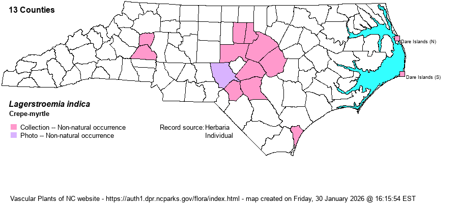 | Phenology | Flowering and fruiting June-September. Extensively planted for ornament, its flowers are bright and long-lasting during our hottest months. | |