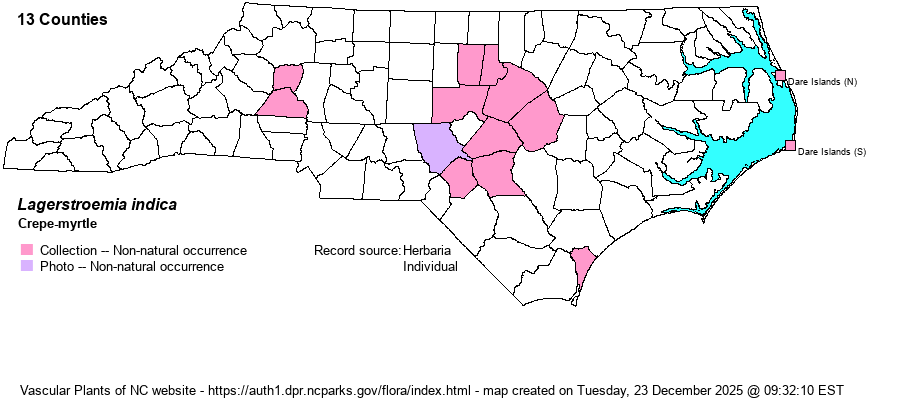| Phenology | Flowering and fruiting June-September. Extensively planted for ornament, its flowers are bright and long-lasting during our hottest months. | |
