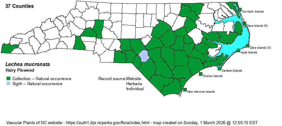 | Habitat | This is a species of open and dry habitats, not restricted to sandy soils as are some Lechea species. It grows in dry openings and clearings, weedy fields, pine/scrub oak sandhills, dunes, margins of maritime forests, and dry margins of upland woods. | |