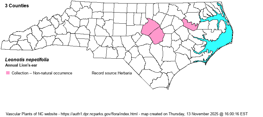 | Distribution | Collected 3 times in NC: Martin County in 1923, Wake County in 1948, and Johnston County in 1957.