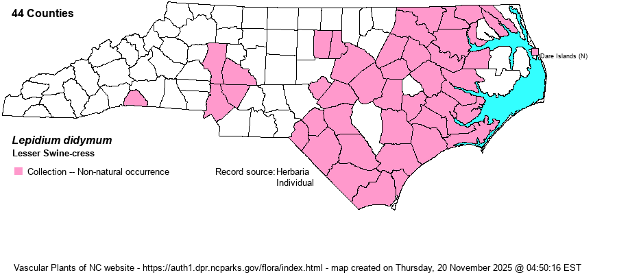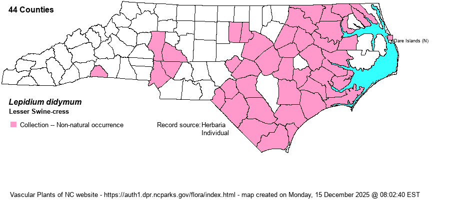 | Taxonomic Comments | This species is often named as Coronopus didymus in RAB (1968) and in many other references. The logic of including this species with Lepidium seems fuzzy.