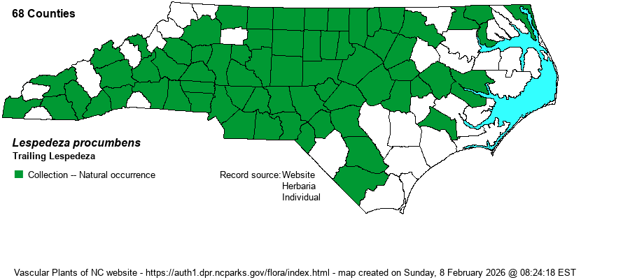 IdentificationEach of these two species -- L. procumbens and L. repens -- are very similar to each other and quite different from any other native Lespedeza species. Each typically has several trailing stems from a single base, growing along the ground to about 2 feet long. This species has the stem, flowering stalks, undersides of the leaflets, and the fruits quite densely hairy, with spreading hairs; the latter species is mostly smooth or at least has appressed hairs. The leaves have short petioles, and the 3 leaflets are quite small, each being elliptical with a rounded apex, only about 3/5-inch long and less than 1/2-inch wide. However, the flowering stems, coming off some of the leaf axils, have quite long stalks and generally are erect or leaning, growing to about 3 inches long, with perhaps a dozen small purplish flowers growing near the top of the stalk. Galactia species are also trailing and have three rounded leaflets, but their leaflets tend to be larger, brighter green and often shiny, and the flowers are usually close to the stem. Both Lespedeza species are commonly seen in the Piedmont, whereas the latter (L. repens) is also quite frequently seen in the rest of the state. You might need to get down on your hands and knees to tell the difference between the two, though you likely won't need a hand lens.