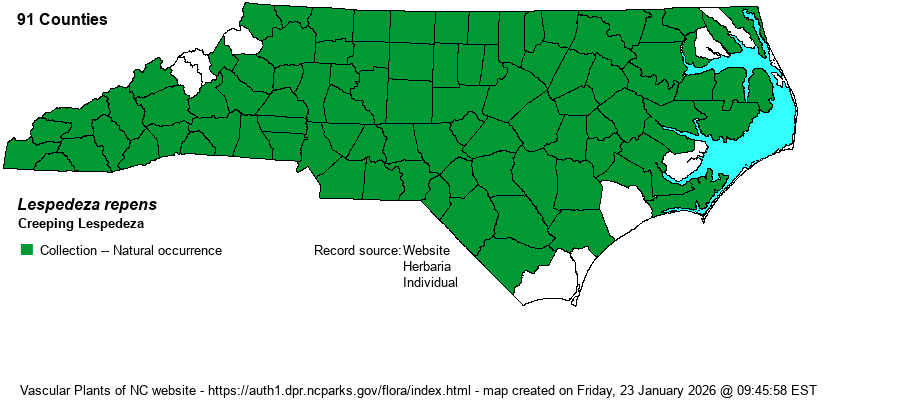 | Identification | L. repens and L. procumbens are very similar to each other and quite different from other native Lespedeza species. Each typically has several trailing stems from a single base, growing along the ground to about 2 feet long. This species has the stem, flowering stalks, undersides of the leaflets, and the fruits somewhat glabrous to moderately hairy but with the hairs appressed and not sticking straight out; the latter species has densely pilose stems, flowering stalks, and other parts such that the hairs stick straight out. The leaves have short petioles, and the 3 leaflets are quite small, each being elliptical with a rounded apex, only about 3/5-inch long and less than 1/2-inch wide. However, the flowering stems, coming off some of the leaf axils, have quite long stalks and generally are erect or leaning, growing to about 3 inches long, with perhaps a dozen small purplish flowers growing near the top of the stalk. Galactia species are also trailing and have three rounded leaflets, but their leaflets tend to be larger, brighter green and often shiny, and the flowers are usually close to the stem. Both Lespedeza species are commonly seen in the Piedmont, whereas this species is also quite frequently seen in the rest of the state; L. procumbens is not common outside the Piedmont. You might need to get down on your hands and knees to tell the difference between the two, though you likely won't need a hand lens. | |