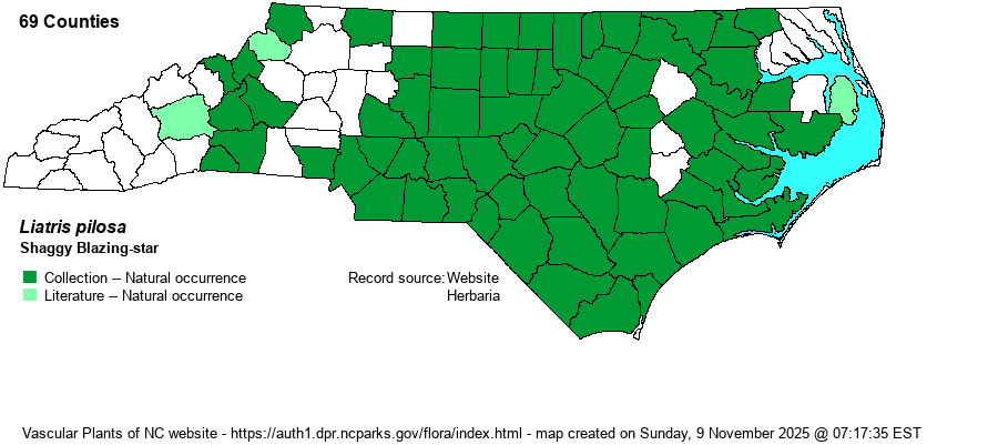 | Identification | Blazing-stars typically have single stems, many slender leaves, and a terminal spike-like inflorescence of disk florets only. They grow from very hard, roundish, underground corms. Shaggy Blazing-star grows 1.5-4 feet tall, 1-several stems from a single corm, stems upright to leaning, lower leaves lance-linear and generally without stalks, middle and upper leaves progressively narrower, shorter, and stalkless. The heads are narrow, have 6-13 pink-purple florets, and occur all around the stem; the involucral bracts are pilose and blunt-tipped. Note the fine white hairs along the margins of the leaves, sticking out like eyelashes. Those are lacking in Sandhills Blazing-star (L. cokeri). Wand Blazing-star (L. virgata) is very similar, but its involucral bracts are acute (vs. blunt) and its heads are loosely arranged (vs. densely). | |