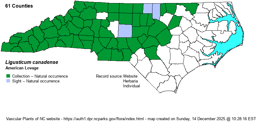 | Identification | This is a familiar umbel of mesic to rich hardwood forests and small openings, one of the few in the family that grows inside rich forests. It has a stout stem, and grows to about 3 feet tall, being freely branched. The alternate stem leaves are bipinnately or tripinnately divided, with the leaf segments ovate in shape with some serrations on the margins. The leaflet texture is thin (as opposed to thick in Angelica racemosa); the average leaflet is 2-3 inches long and about 1-inch wide, with a rounded to truncate base -- which characteristically is not toothed. Though the leaves are divided several times, the leaf with its many leaflets is not cut into lacy, fern-like segments. The umbel at the end of the stem is usually consisting of 3-4 smaller umbels on terminal branches, with many small umbellets and tiny white flowers. Normally, biologists can identify the species just from its leaflets, as they are ovate and not finely dissected, though there are serrated margins except for the untoothed base. Thankfully, they get much practice, as this is not a scarce species. | |