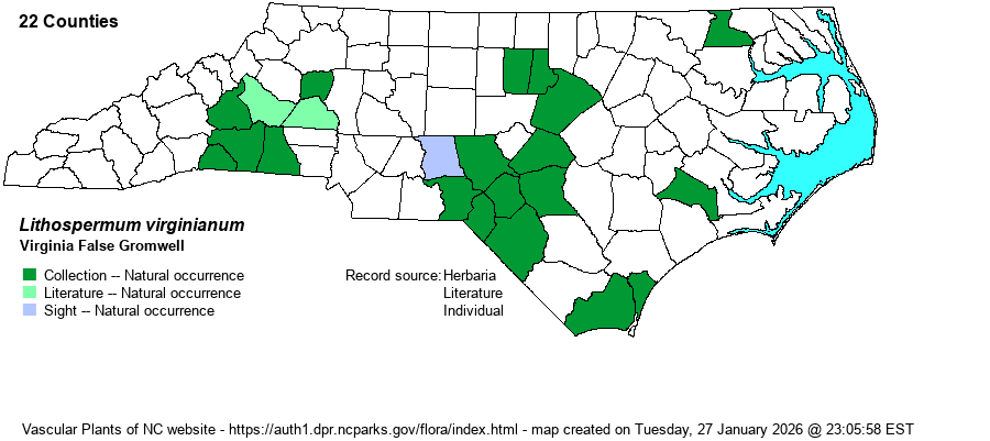 | Identification | This is a medium-sized herb, with some short branches in the upper portions; it grows to about 1.5-2 feet tall. The alternate leaves are rather scattered, being oblanceolate to oblong, those on the lower stem being long-tapering to the base; they are about 3 inches long and 3/4-1-inch wide, and are usually hairy as is the stem. The leaves have characteristically parallel veins that are deeply sunken on the upper surface. At the upper part of the stem and branches grow long, curled flower clusters (helicoid cymes), often reaching 5-6 inches long. Although most references say the flowers are yellow to orange, those in NC tend to be pale greenish to very pale cream-yellow in color -- paler than the green leaves but hardly drawing attention. The flowers are tubular, about 2/5-1/2-inch long, with narrow and pointed corolla lobes. Often more attention-getting are the nutlets -- each is rounded and dull white, about 1/10-inch across -- reminding many of the seeds of Scleria [nutrush] species. The parallel-veined leaves and the long and curled flower clusters should suffice for identification. | |