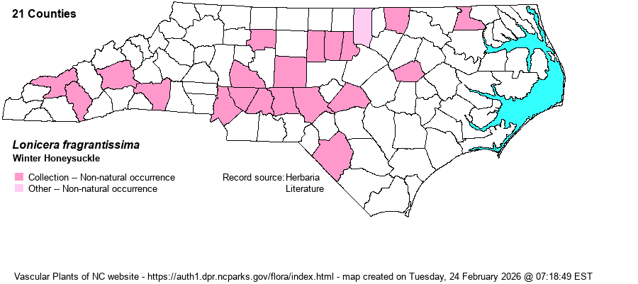 | Identification | Winter Honeysuckle is one of our first plants to bloom. It is a many-branched shrub to 7 feet tall, the leaves ovate to elliptical, short-stalked, and opposite. The flowers have short tubes and flaring lobes, white to yellowish or pinkish, reasonably fragrant. None of our other alien or native honeysuckles begin to bloom so early. | |