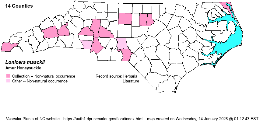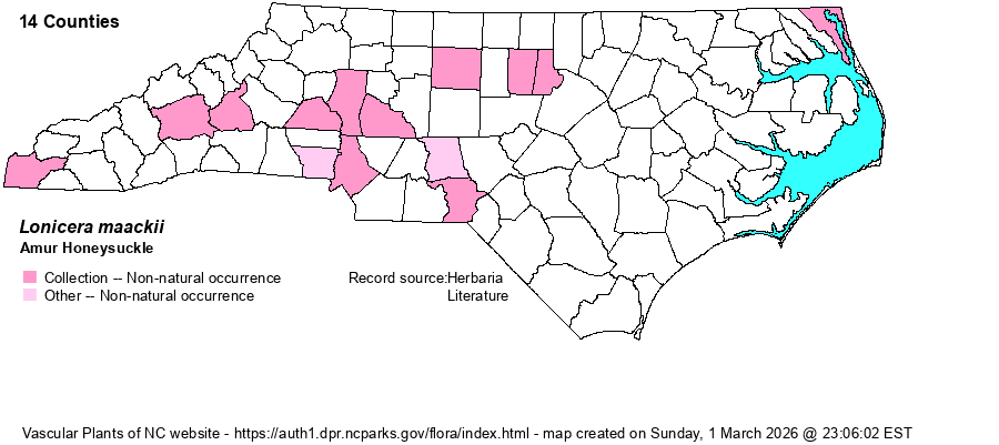 | Distribution | Scattered in the Mountains and Piedmont; disjunct to Currituck County on the outer Coastal Plain. First collected in 1987 on the campus of Duke University, Durham County. Cultivated plants were vouchered as far back as 1961 (Mecklenburg County).