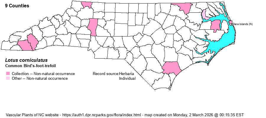 | Distribution | Scattered across the state. First collected from a pasture in Iredell County in 1937. Apparently slow to colonize new sites. Visual inspection of digital specimens at SERNEC (2026) shows that certain records from Dare and Randolph counties are L. tenuis, due to narrow leaflets and small flowers.