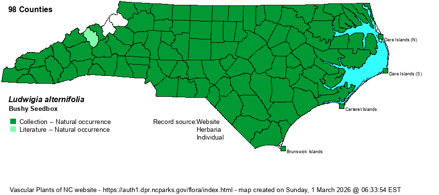 | Abundance | Common to very common throughout, except common in the Mountains. Likely not numerous at high elevations. Of the 20 native Ludwigia species, this one is by far the most numerous of the erect species, being the default one to which all others need to be compared. | |