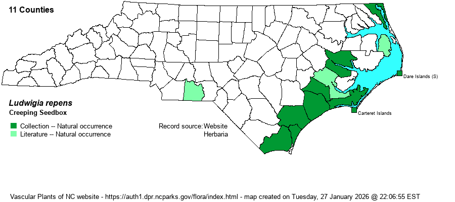 | Identification | This is a tiny, decumbent, creeping plant, growing to about 2-3 feet long. It has small, opposite leaves, each of which is oblanceolate (somewhat wider above the middle) to elliptic, but only about 2/3-1-inch long and 1/2-inch wide. This species may have petals -- the very common L. palustris does not -- but some plants do not. If present, they (4) are pale yellow and very small, with the spread flower barely 1/4-inch across. At least, the 4 sepals are persistent and are triangular. Most importantly, in this species the floral tubes and capsules lack green banding, whereas in L. palustris the floral tube and capsule have 4 longitudinal dark green bands. Good luck in trying to identify this species, as various references are not consistent in their descriptions. If you are lucky to see yellow petals on such a plant, congratulations; but otherwise you likely will need to look at the capsules for green stripes/bands (which this species lacks and the common one does have). | |
