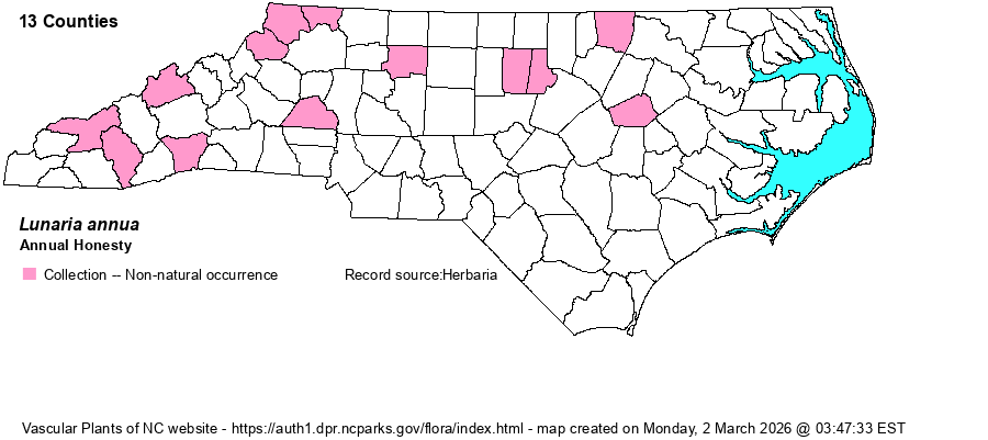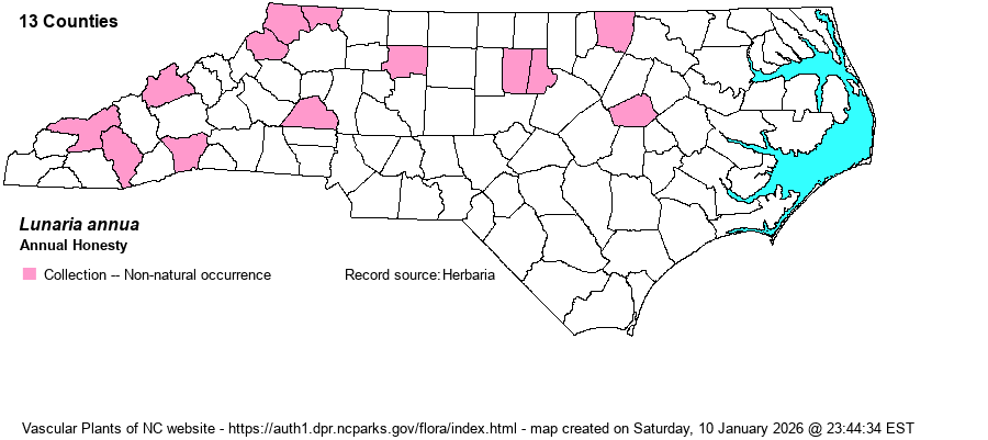 | Identification | This species is cultivated for its rosy, magenta, or white flowers and especially for the large, broadly elliptical, papery pods that are flattened such that the seeds can be easily seen. The flowers look quite a bit like those of Dame's Rocket (Hesperis matrionalis), but the fruits are very distinctive. | |