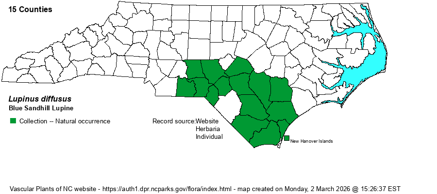 | Abundance | Common in the Sandhills region, but less numerous eastward. Can be fairly common to locally common in southern coastal counties, but mainly infrequent to locally fairly common in the central portions of the range; yet to be recorded from Robeson County. Blue Sandhill Lupine is a biennial, producing basal leaves one year (they overwinter) and flowers the next. | |