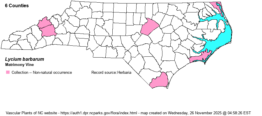 | Distribution | Widely scattered in the outer Coastal Plain, lower Piedmont, and the Mountains. Specimens from Forsyth, Guilford, Mecklenburg, and Orange counties are misidentified or from cultivated plants.
