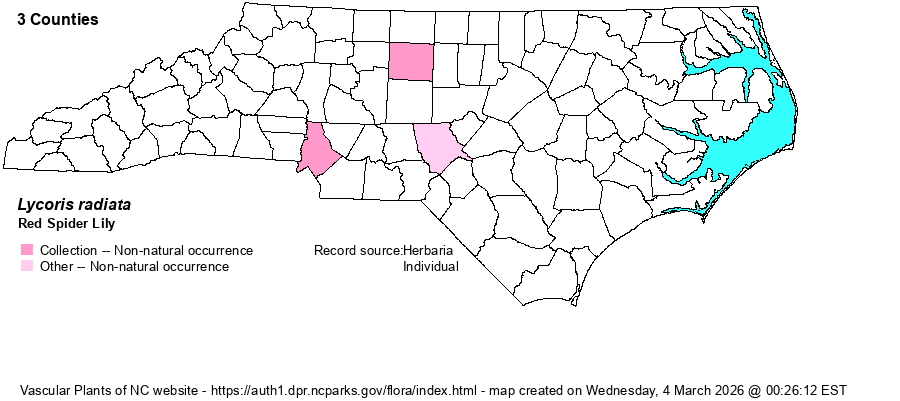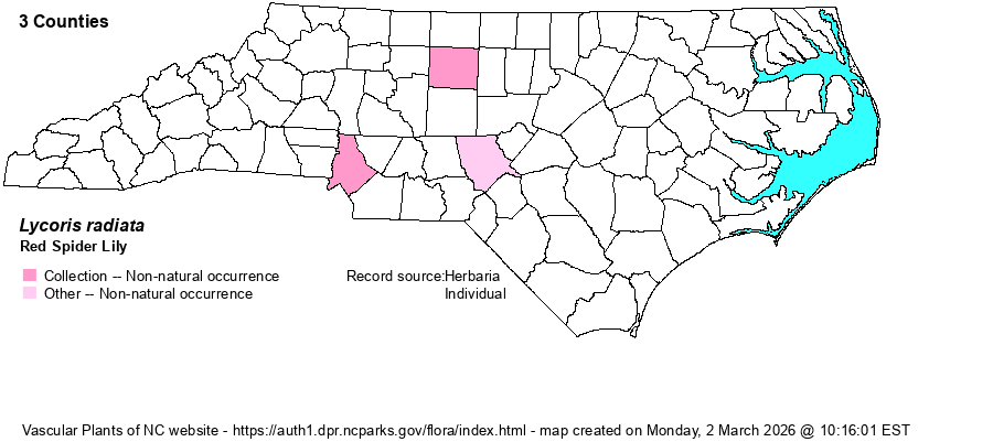 | Distribution | Known as escapes from Guilford, Mecklenburg, and Moore counties, all in the Piedmont. A collection from Orange County was from a garden.