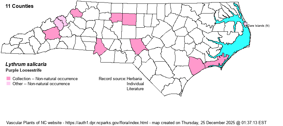 Native of Eurasia; in N.A. in every southern Canadian province and US state except FL, LA, and SC. This is one of the most problematic and aggressive alien weeds in North America, replacing native vegetation from whole marshes or sections of marshes. For now, most of this damage has occurred in states well to the north of NC. | |