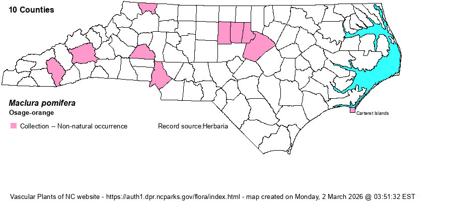 | Taxonomic Comments | Weakley (2018) states that M. tricuspidata Carriere is locally naturalized in Orange County, but we have not seen corroborating specimens.