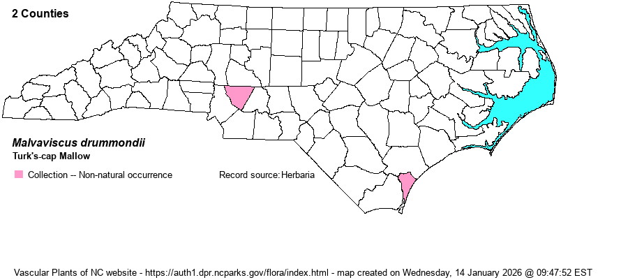 | Account for Turk's-cap Mallow - Malvaviscus drummondii Torrey & A. Gray | Only member of Malvaviscus in NC. | |||||||||