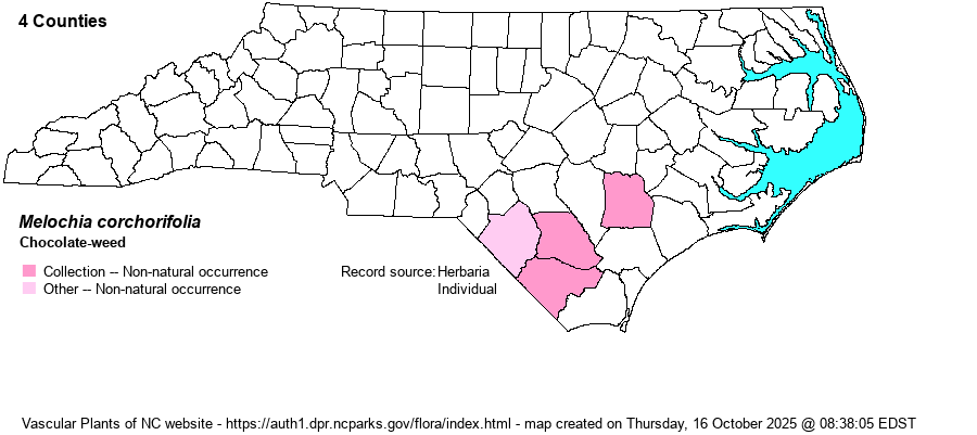 Identification | Chocolate-weed is an annual or perennial, sub-shrub or shrub up to 6 feet tall. The leaf blades are ovate to lance-shaped, 1-4 inches long, bluntly toothed. The flowers grow in terminal cyme-like groups of 10-25, the short petals purple to pink with a yellow base. | |