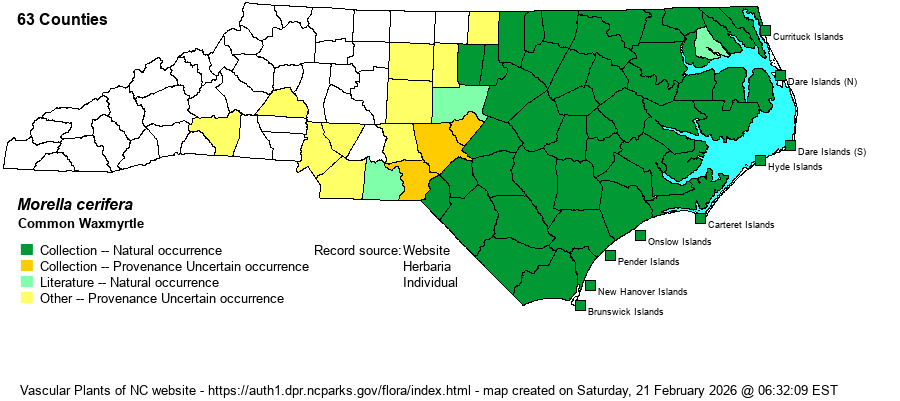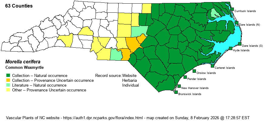 | Taxonomic Comments | All Morella species were, until recently, included in the genus Myrica -– i.e., Myrica cerifera. RAB (1968) and some other references have the species split into the nominate var. cerifera and the small-stature form -– var. pumila. Some references do not have these forms broken out at all, whereas Weakley (2018), this website, and perhaps a few others have these forms split as separate species.