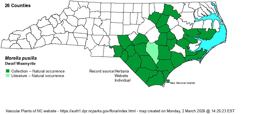 | Taxonomic Comments | Weakley and Poindexter, in a 2023 issue of Journal of the Botanical Research Institute of Texas, argue that the oldest valid species name is pusilla, not pumila. Most references do not recognize either name as a valid species and lump it within M. cerifera; however, Weakley (2018) does, as does this website. Weakley and Poindexter give a number of reasons for elevating it to species status. In fact, most veteran NC field biologists who are familiar with both forms likely would consider each as valid species. At least, RAB (1968) recognized the differences, and named this taxon as a separate variety – var. pumila. In fact, the RAB map shows records for over half of the Coastal Plain counties, ranging to the VA line, whereas the BONAP map is woefully incomplete.