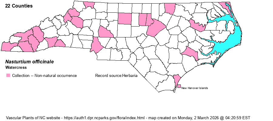 | Identification | Watercress has thick stems and many leaves. The leaves are sessile and are divided into 3-13 rounded leaflets (in pairs plus a terminal leaflet). The flowers are white, on stalks from axils or terminal. The pods are slender, somewhat curved, on skinny curved pedicels. Inexperienced people might confuse it with the native Cardamine pensylvanica, which also grows in seeps and springs, but that species has erect stems (vs. more ascending or spreading in Nasturtium) and the leaflets are usually narrower and less thick/fleshy. | |