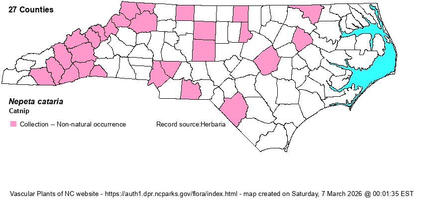 | Identification | Catnip stems are usually much branched and 2-3 feet tall. The leaves are noticeably triangular in shape (the base the shortest side), with marginal teeth. The plant is essentially covered with very short, dense, fine pubescence. The flowers are white, the lower lobe dotted with purple; they grow from axils and terminally in dense to loose clusters. | |