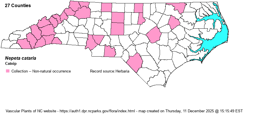 | Identification | Catnip stems are usually much branched and 2-3 feet tall. The leaves are noticeably triangular in shape (the base the shortest side), with marginal teeth. The plant is essentially covered with very short, dense, fine pubescence. The flowers are white, the lower lobe dotted with purple; they grow from axils and terminally in dense to loose clusters. | |