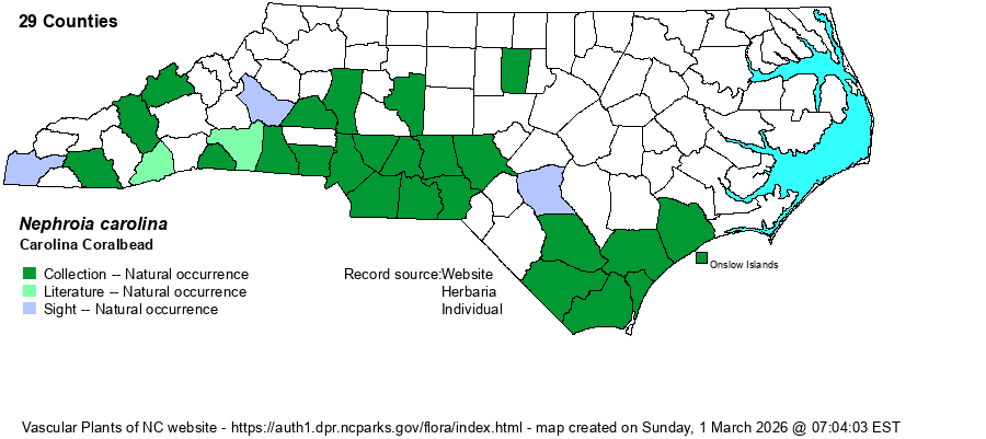 | Distribution | Present over the southern halves of the Mountains and Piedmont, north to Madison, Iredell, and Davidson counties, sparingly to Orange County. Also found in the southern third of the Coastal Plain, but north only to Cumberland and Onslow counties.