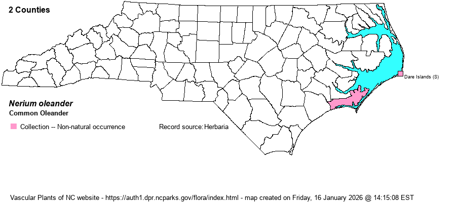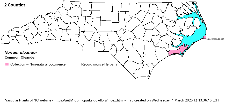 | Distribution | Collected once on the mainland of Carteret County (1998) and several times on Hatteras Island, Dare County (1966-76). Commonly planted and seen along and near most of our coast, especially along residential streets, but apparently seldom escapes.