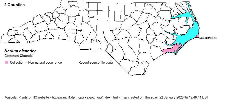 | Distribution | Collected once on the mainland of Carteret County (1998) and several times on Hatteras Island, Dare County (1966-76). Commonly planted and seen along and near most of our coast, especially along residential streets, but apparently seldom escapes.