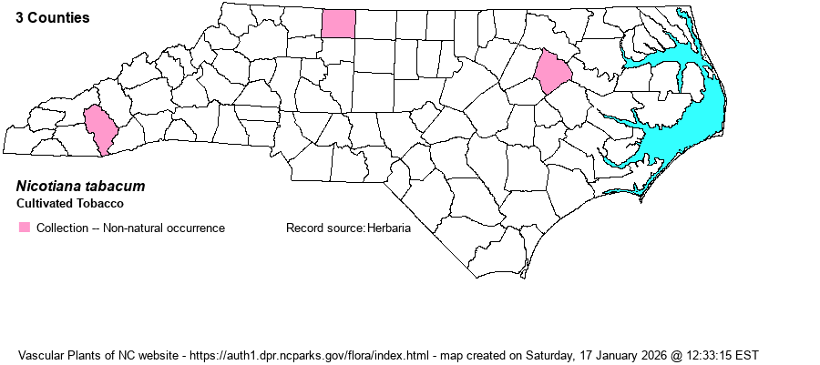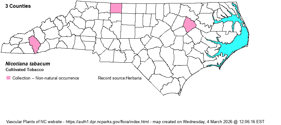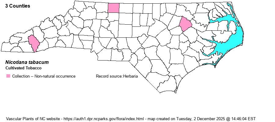 | Distribution | Three widely separated counties: Edgecombe, Stokes, and Jackson. Other specimens from 7 counties are all from cultivated plants.