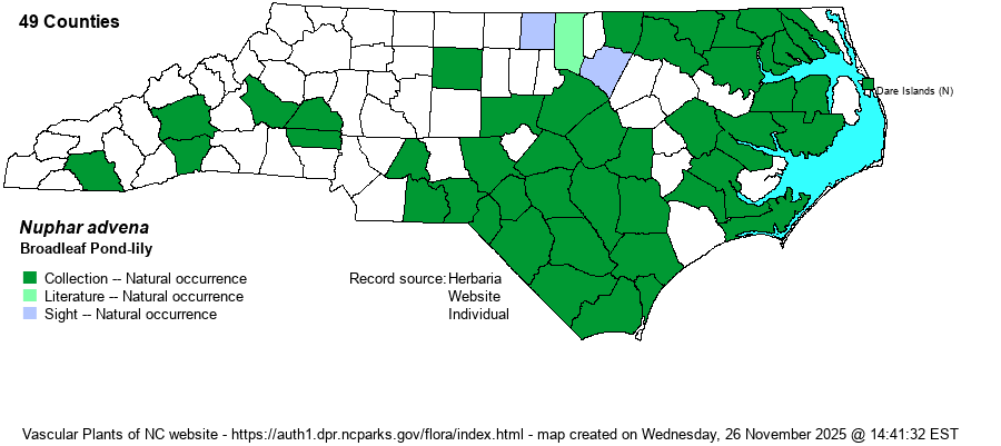 | Taxonomic Comments | This species has often been named as Nuphar lutea or Nuphar luteum. Many older references consider N. sagittifolia as a variety or subspecies of N. advena. See that species for more details.