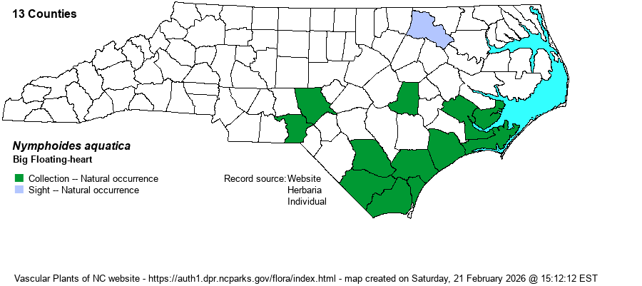 | Distribution | Present over the southeastern portion of the Coastal Plain, from Pamlico County to the SC border. Widely scattered elsewhere in the province, including the Sandhills, and north to Halifax County. Specimens from Johnston county are actually N. cordata. The species does occur sparingly in eastern VA, and thus it should be found in other northeastern NC counties.