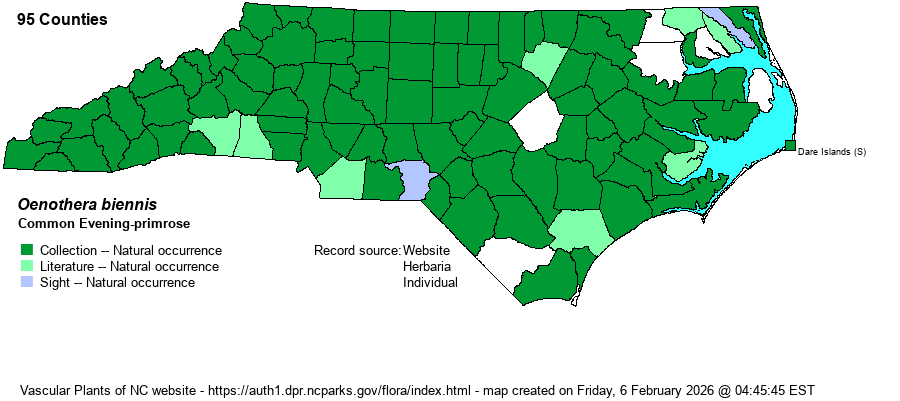 | Identification | This is an easily found species by biologists and the public, almost too common to become interested in it. It is a robust, very tall herb, growing to 5-6 feet tall, mostly unbranched or with a few small branches near the top of the stem. The very numerous alternate leaves are very long, about 6-8 inches long and 1-2 inches wide, lanceolate to narrowly elliptic, with serrated margins. The inflorescences are terminal on branch ends, with individual flowers from the axils of the uppermost leaves, on long floral tubes over 1-inch long. The 4 petals are pale to medium yellow (but not rich yellow), about 1.5 inches long but ascending, such that the flower is about 1.5-2 inches broad. Even without the flowers, this is normally an easily identified species owing to its tall stem, with the stem often dark red, and the abundance of alternate, long leaves. However, there are two other tall species present in the state that are very similar and have in the past been included within it. O. nutans and O. parviflora also occur in NC, mainly in the mountains. See the species accounts for these for some character differences. Generally speaking, these two have smooth/hairless inflorescences, versus pubescent in O. biennis, and O. parviflora has flowers only half the size of the other two. | |