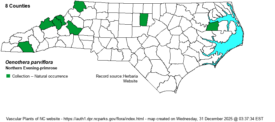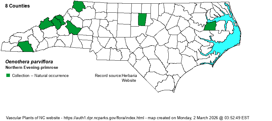 | Identification | This species is the common to abundant northern "cousin" to O. biennis, though the ranges overlap. This species is very similar to it but averages shorter in stature, but the main difference is that this species has noticeably smaller flowers. Each petal is about 1/2-inch across, and thus the flower is barely 3/4-inch across, as the petals are ascending. Weakley (2018) also mentions that the inflorescence is glabrous, as opposed to conspicuously pubescent in O. biennis. The stem is also somewhat glabrous, as opposed to hairy in O. biennis. Note that the very similar O. oakesiana, a split off from O. parviflora, has the tip of the inflorescence curved, as opposed to erect in the other two species; and its leaves are dull green to gray-green, as opposed to bright green in O. parviflora and O. biennis. However, there are no definitive records of that species in NC. Check Weakley (2018) for other characters for separating these three species. You likely will have trouble identifying this species, but the most obvious field marks will be the noticeably smaller flowers, less than 1-inch across, and the smooth green parts of the plant. It probably is not overly rare in the state, owing to the scatter of county records and its disturbed habitats, which are abundant across the state. | |