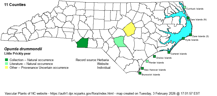 | Taxonomic Comments | As with the previous cactus species, this “small” species has also been “batted around” from one scientific name to another over the decades. It has typically been named as O. drummondii (RAB 1968) and Weakley (2018), but others have named it as O. pusilla, as does NatureServe.