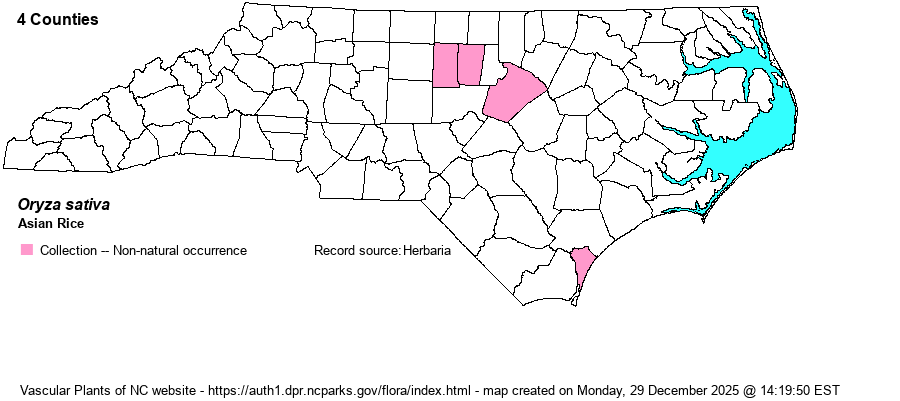 | Distribution | 9 specimens are at SERNEC, but not a single one is definitely from outside of cultivation. We have mapped all of them that gave a county name; the rest did not ("oriente Carolina Septentrionalis", etc.). Specimens that had images attached all had "cult.", "cultivated", "arvis", or "aratis" on labels. The earliest collection, and the one that has the most likelihood of being outside of cultivation, is at herbarium MO; unfortunately there is no image and not all label data are given: "Wilmington", 1847, M.A. Curtis s.n. (MO).