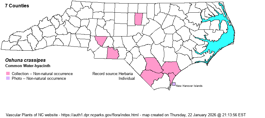 | Taxonomic Comments | Weakley (2020) transferred it from Eichhornia crassipes to Piaropus crassipes. However, in his 2022 floras, he follows Haines, who said that the former Piaropus genus name is invalid and who coined a new genus name of Oshuna.