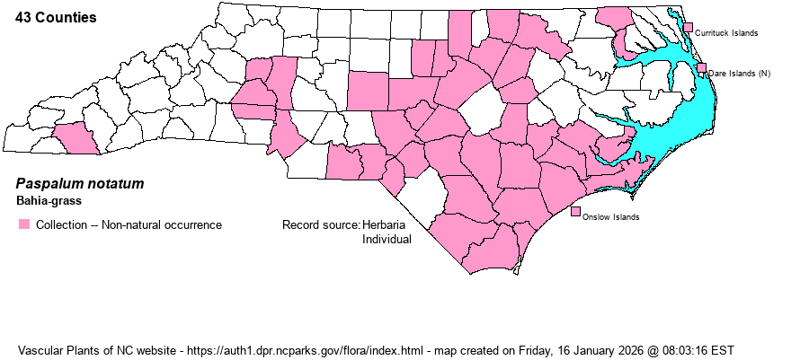 | Distribution | Coastal Plain, Sandhills, and Piedmont; disjunct to Macon County in the Mountains. Certain to increase its distribution, as it is often used in roadside seed mixes, for erosion control, and as a turf grass.