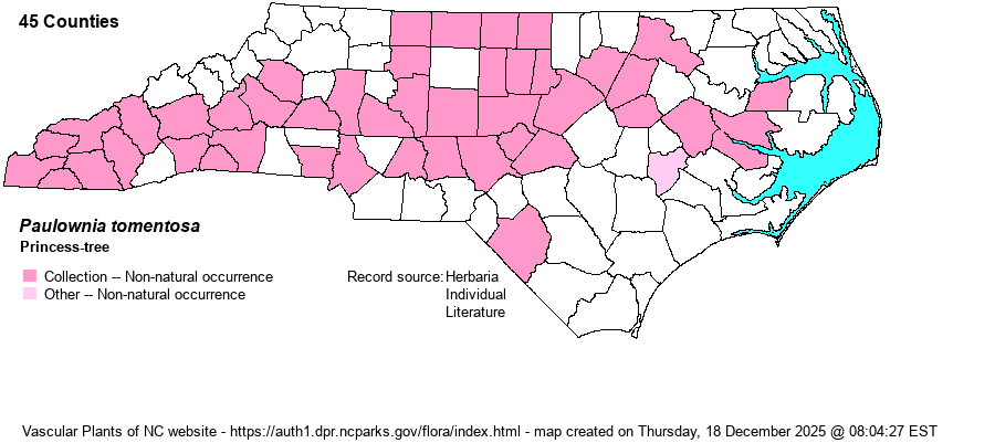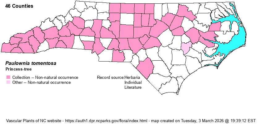 | Abundance | Locally quite common in the southern Mountains; fairly common in the Piedmont, uncommon in the northern Coastal Plain, but rare in the Sandhills. It is an aggressive weedy tree in parts of the Mountains. | |