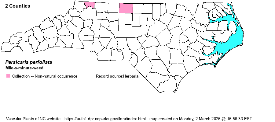 | Abundance | Very rare. However, one population in Alleghany County had 1000+ plants in 2010. This aggressive alien has been declared a noxious weed in a few states, and it is important that all NC occurrences be eradicated. | |