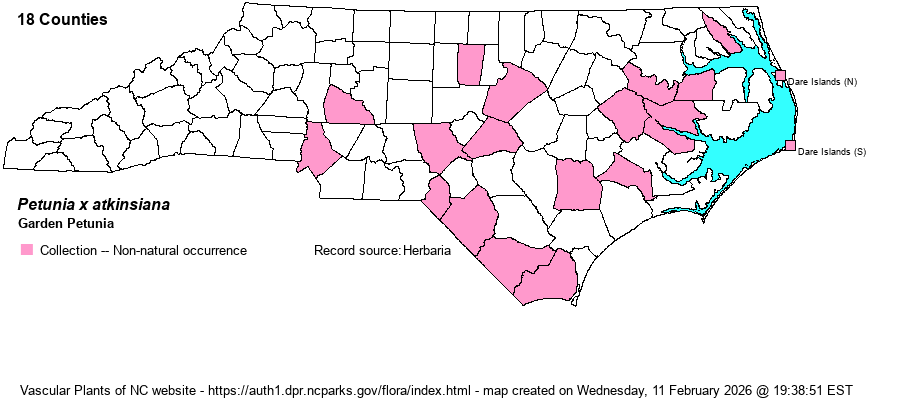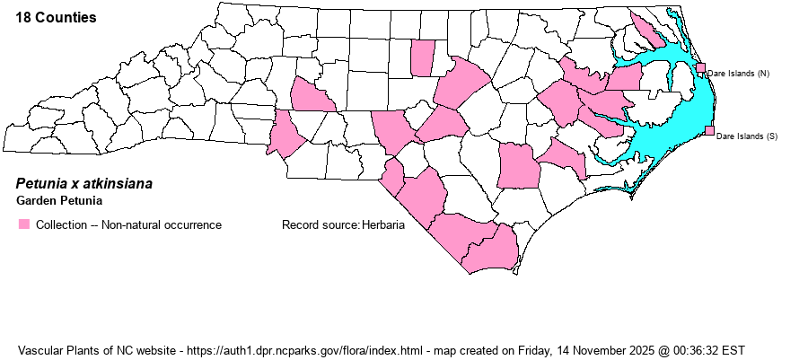 | Identification | The familiar Garden Petunia is sold abundantly in NC as a hanging or pot plant. The large red-purple to violet flowers are a favorite. | |