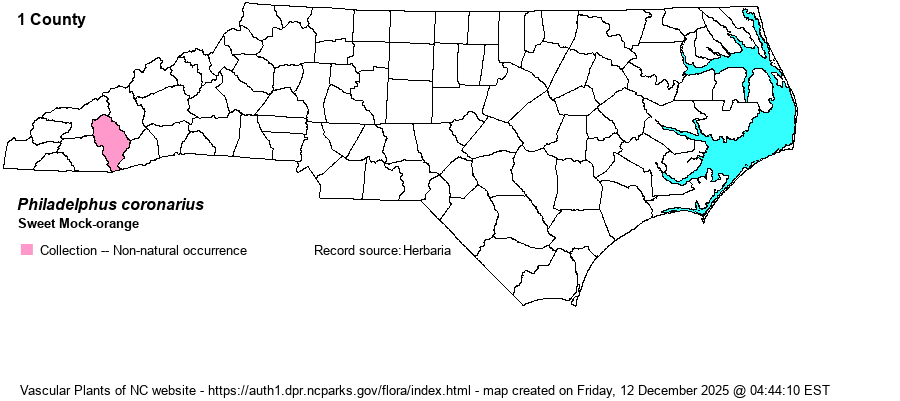 | Distribution | Of 4 collections from Jackson County at SERNEC, only 1 is accompanied by an image with label data; it was stated to be a waif from cultivation. BONAP maps it only in Jackson County. Other specimens from Forsyth, Mecklenburg, and Orange counties are of cultivated plants.
