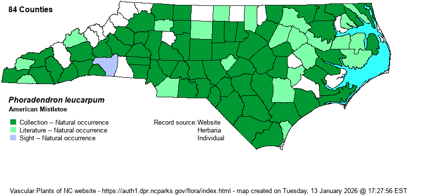 | Taxonomic Comments | The species was formerly named as Phoradendron flavescens and also as P. serotinum (in RAB 1968). Weakley (2018) and others have the species split into several subspecies, not surprising given its very wide range; the taxon here is listed as P. leucarpum ssp. leucarpum.