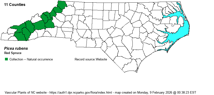 | Abundance | Though technically an uncommon tree in the Mountains, as with the Fraser Fir (Abies fraseri), it is common and easily found at higher elevations, usually mixed with the fir from elevations around 5000-5800 feet. Scarce below about 4500 feet elevation. Note that there are some peaks in the state over 5000 feet where neither spruce nor fir are found, such as most of those in the Amphibolite Mountains of Ashe and Watauga counties (i.e., north of Grandfather Mountain). Compared with Fraser Fir, this species has been relatively free of major die-offs in the state, though acid precipitation has been a problem to a small extent. | |